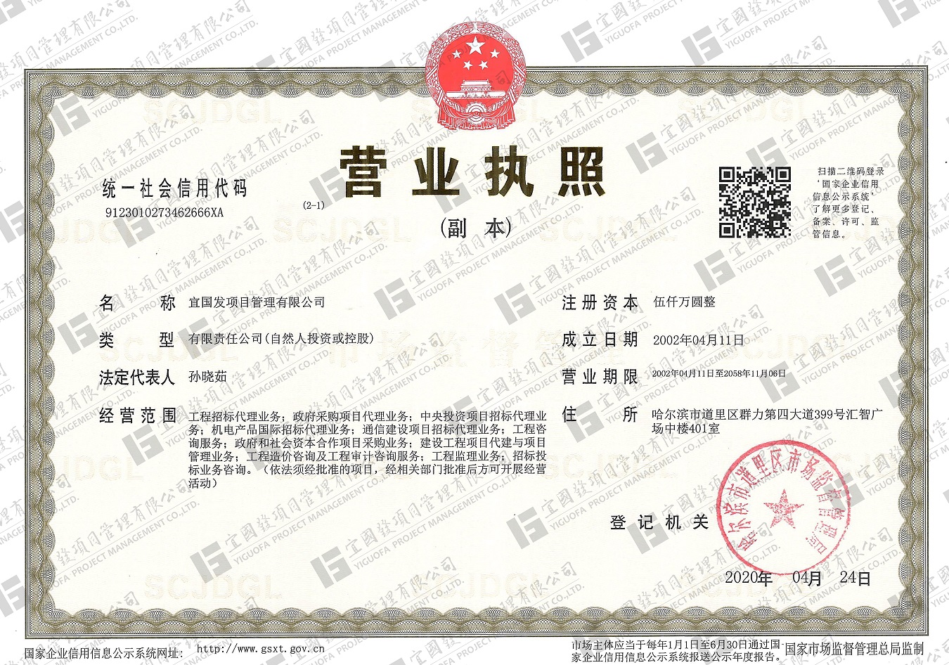 宜國發項目管理有限公司(原名黑龍江國發項目管理有限責任公司)成立于2002年4月,公司注冊資金5000萬元人民幣,具有獨立法人資格。現具備國家住房和城鄉建設部頒發的工程招標代理機構甲級資質,發展和改革委員會頒發的中央投資項目招標代理機構甲級資質、財政部頒發的政府采購代理機構甲級資質,黑龍江省住房和城鄉建設廳頒發的工程造價咨詢企業甲級資質,并已納入全國投資項目在線審批監管平臺工程咨詢單位備案名單、“中國政府采購網”政府采購代理機構名單及“中國國際招標網”機電產品國際招標代理機構名單,且通過了質量管理體系、環境管理體系、職業健康安全管理體系認證。